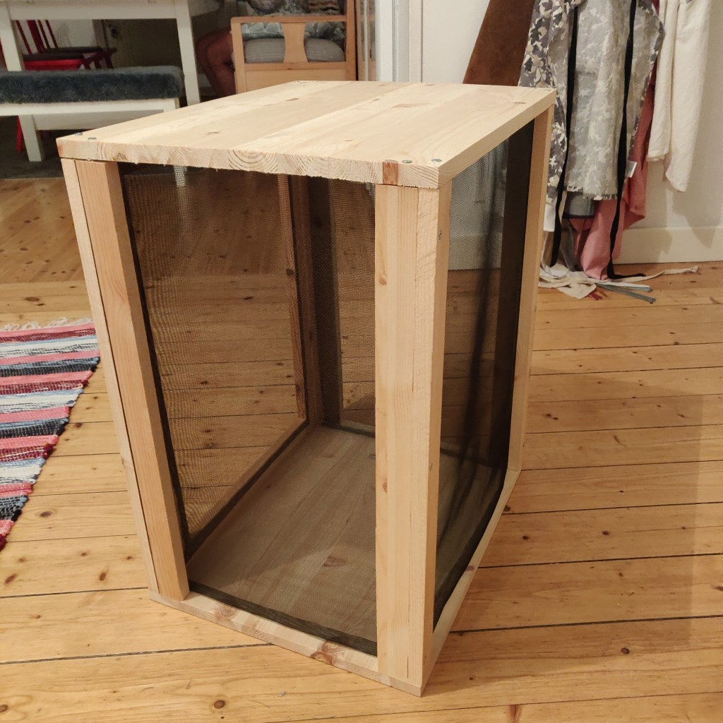 Har blivit en del larver och puppor under sommaren, dessa behöver ett härbärge under vintern för att kunna kläckas ut till våren. Lite snickrande och lite myggnät från Biltema och voilá – en bur ser dagens ljus. Behövs ett par gångjärn till dörren så är det inflyttningsklart.